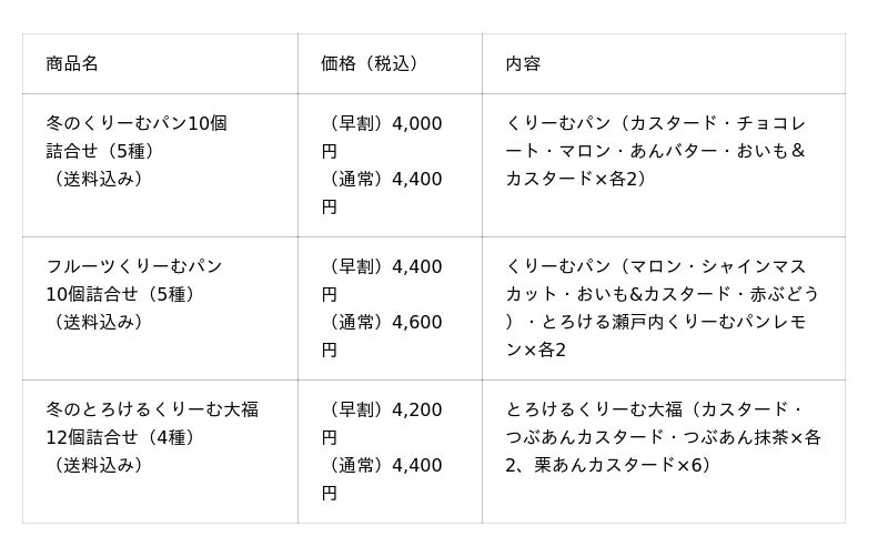 くりーむパンのセットには期間限定で好評販売中のフレーバー「あんバター」「マロン」、本年よりオンラインショップに初登場した「おいも&カスタード」が入った詰合せのほか、シャインマスカットや赤ぶどうなどのフルーツフレーバーを楽しめるセットもご用意しました。