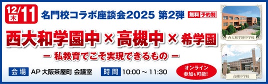 この度、毎回ご好評をいただいております「名門校コラボ座談会」の2025年度第2弾といたしまして、《西大和学園中×高槻中×希学園》を下記要領にて実施いたします。