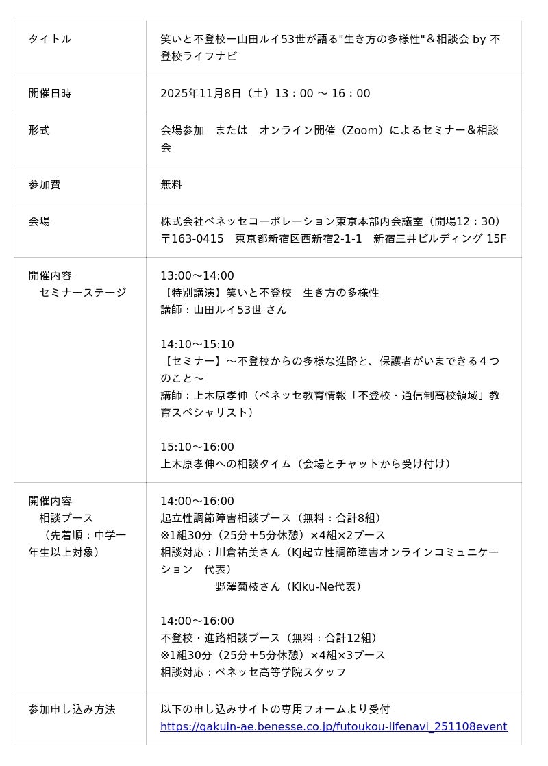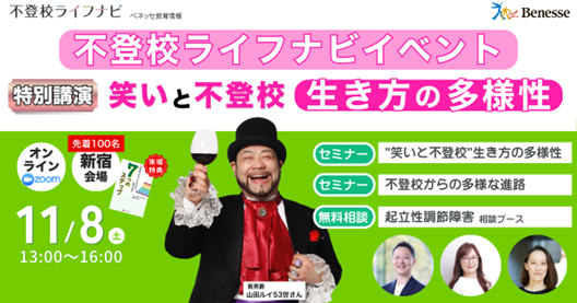 株式会社ベネッセコーポレーション(本社:岡山県岡山市、代表取締役会長兼社長:岩瀬大輔、以下:ベネッセ)が運営する、不登校に関わるご家族やお子さま向け情報発信サイト「不登校ライフナビ」は、2025年11月8日(土)ハイブリッドセミナー&相談会「笑いと不登校ー山田ルイ53世が語る"生き方の多様性"&相談会 by 不登校ライフナビ」を開催します。