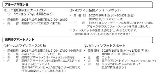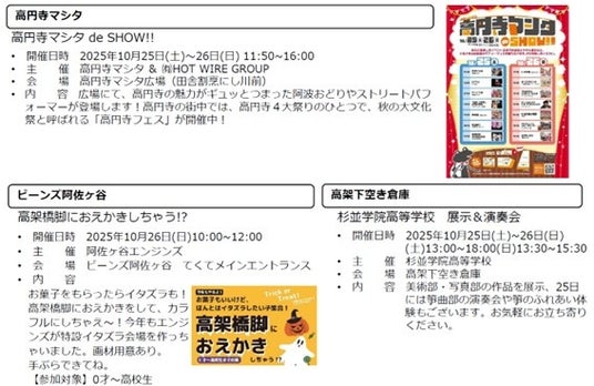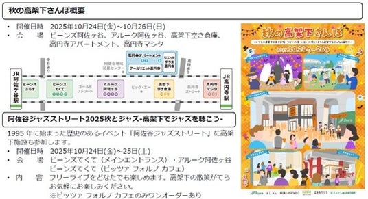 ジェイアール東日本都市開発では、阿佐ヶ谷・高円寺エリアの方に「歩きたくなる高架下」と感じていただけることを目指し、「阿佐ヶ谷・高円寺プロジェクト」という活動を続けています。このたび、2025年10月24日(金) ~10月26日(日)に「秋の高架下さんぽ」と題しまして、期間中さまざまなイベントを高円寺駅~阿佐ケ谷駅間の各施設において開催いたします。