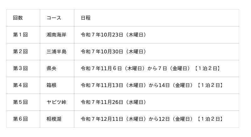 (注記2)第5回はヤビツ峠コースの一部が現在通行止めのため、宮ヶ瀬湖周辺を走る予定です。