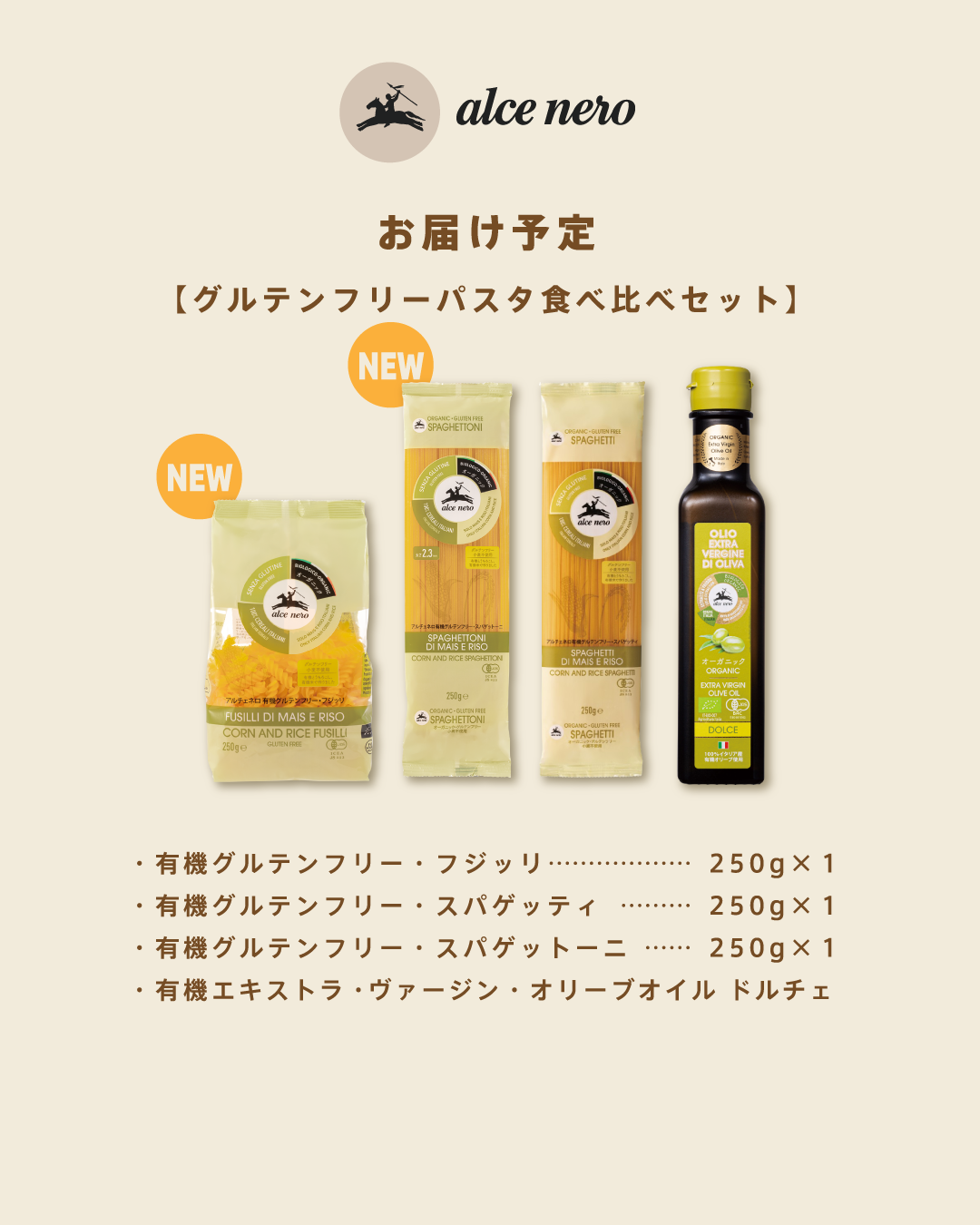 2つの新商品が登場!人気のアルチェネロのグルテンフリーパスタシリーズから、フジッリとスパゲットーニ (太さ2.3mm) が新登場。今回のキャンペーンでは、定番人気のスパゲッティ(太さ1.6mm) と一緒にセットでプレゼントいたします。