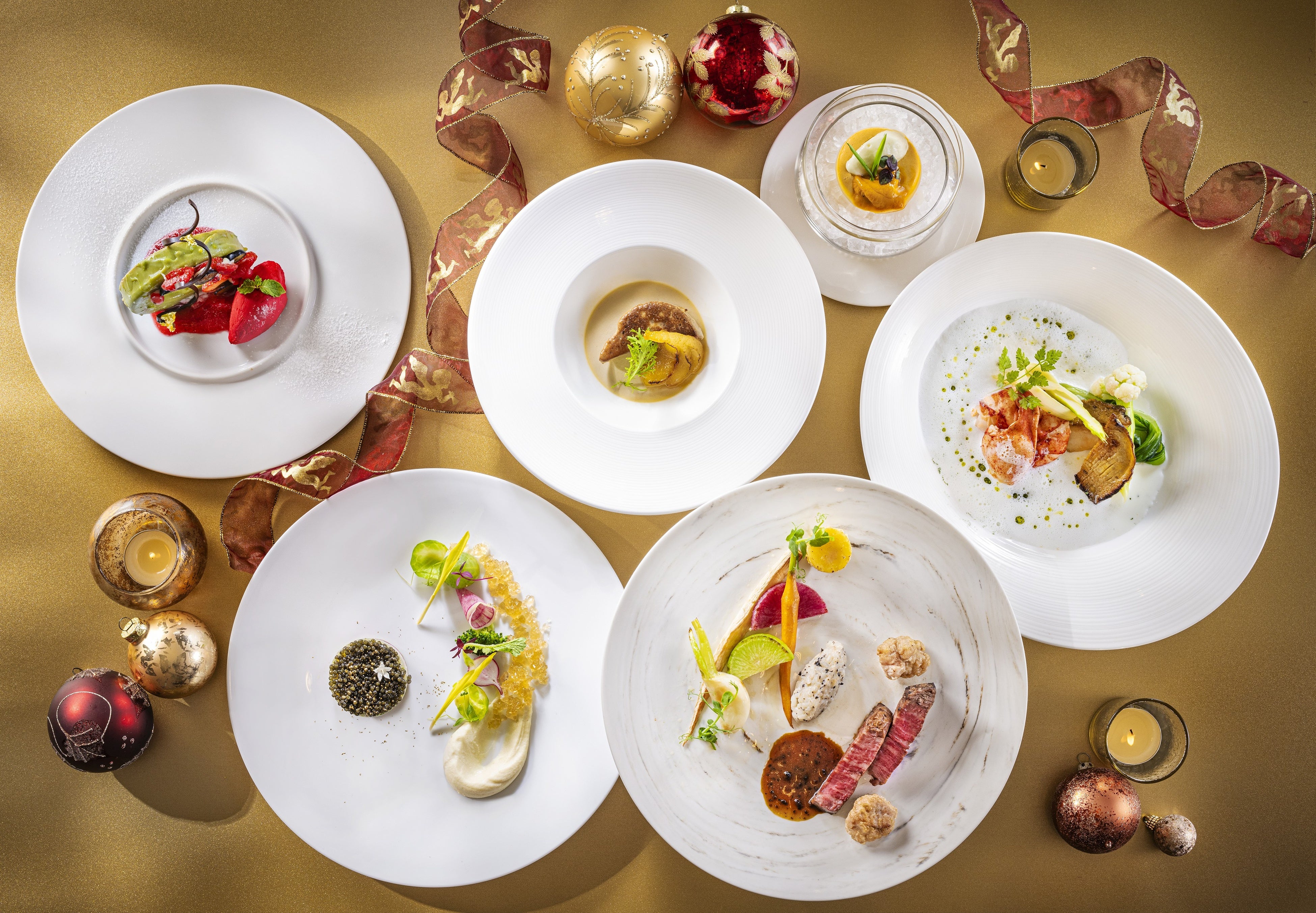 横浜の美しい夜景を望むフレンチ「ベイ・ビュー」では、シェフ高木が厳選した季節の食材を贅沢に使用したクリスマスを彩る特別なディナーコースをご提供いたします。コースの始まりには、雲丹と新鮮なカリフラワーを重ねたヴェリーヌをご用意。海と大地の豊かな味わいを一皿でご堪能いただけます。繊細な旨みを持つタラバ蟹と帆立をガトー仕立てにし、キャビアをふんだんに使用したオードブルには、根セロリのブルーテや、輝く宝石をイメージしたコンソメのジュレが華やかな彩りを添えます。魚料理には、鮮度にこだわった豪華オマール海老や鮑をフリカッセでご用意。シャンパンを用いたカプチーノソースとフレッシュハーブの香りが、素材の美味しさを引き立てます。肉料理には、松阪牛フィレ肉に加え、希少なリードヴォをムニエルでご提供。黒トリュフを惜しみなく使用した濃厚なソースと、芳香なトリュフリゾットを合わせて贅沢なひと品に仕上げました。こだわりのデザートは、希少なベネズエラ産カカオ"チュアオ"で作るショコラムースをピスタチオのチョコレートでコーティングし、赤い果実とともに艶やかなクリスマスリースに見立てました。ディナーのフィナーレを彩るクリスマスならではの一皿です。