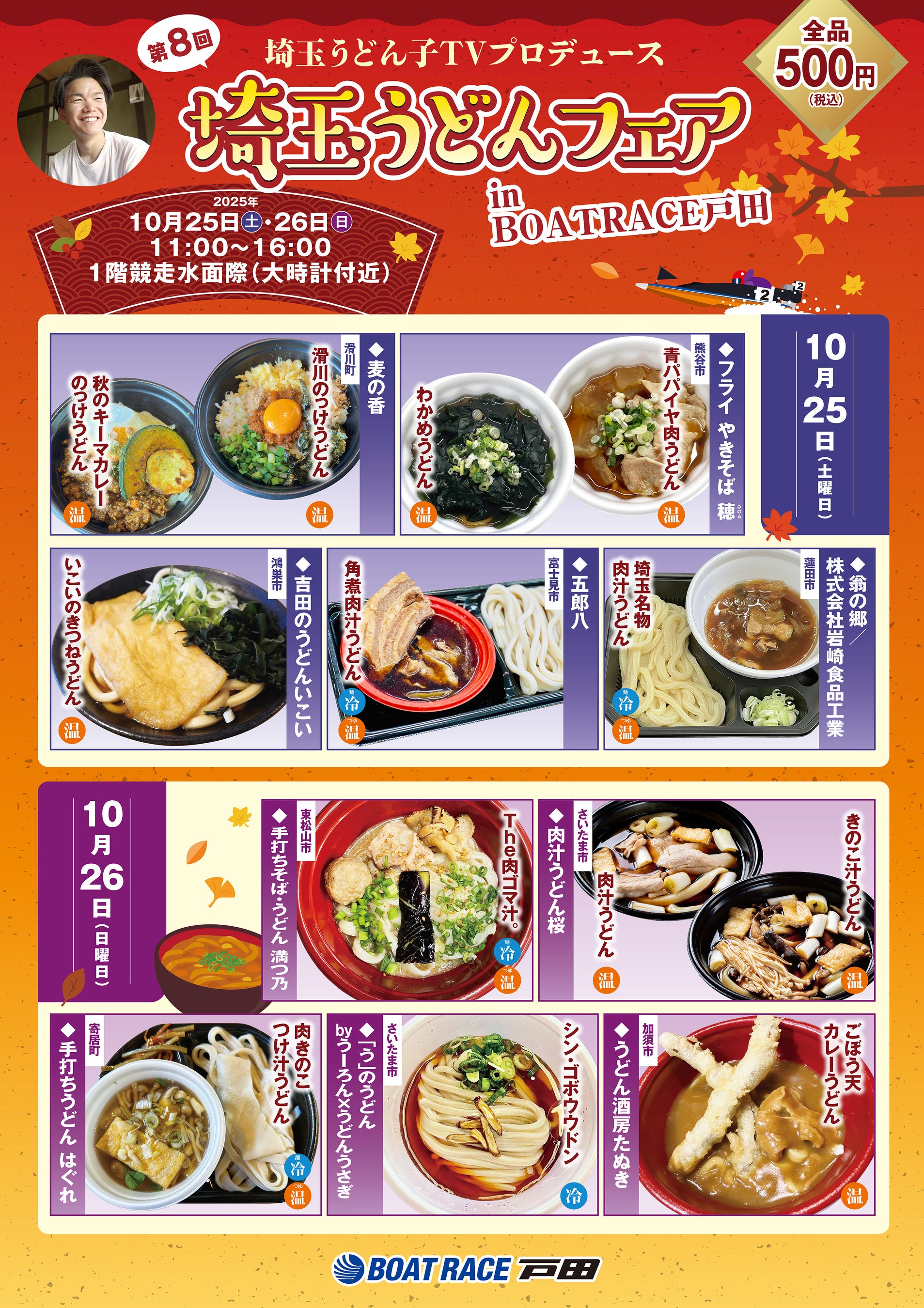 また、第4回漫画アクションカップ開催中の10月25日(土)と26日(日)の2日間は、BOAT RACE戸田ではすでに恒例行事となった人気イベント『第8回埼玉うどんフェア』も実施される。