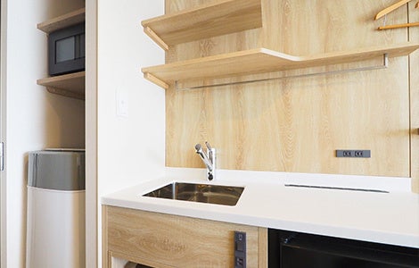 客室の7割以上を占めるダブルルームには、洗濯機・電子レンジ・2ドア冷蔵庫・加湿機能付き空気清浄機・50インチ以上のスマートTVを完備しています。さらに、IHコンロを備えたキッチン付きダブルルーム(15.7平方メートル ~17.2平方メートル /ベッド幅150cm)もご用意しており、自炊しながらの滞在をサポートします。このほか、最大3名様でご利用いただける「スタンダードツインルーム」(約18.7平方メートル /ベッド幅110cm)や、「ユニバーサルダブルルーム」(約22.1平方メートル /ベッド幅110cm2台)もご用意し、ビジネスから観光、ファミリーでのご滞在まで、幅広いニーズにお応えします。