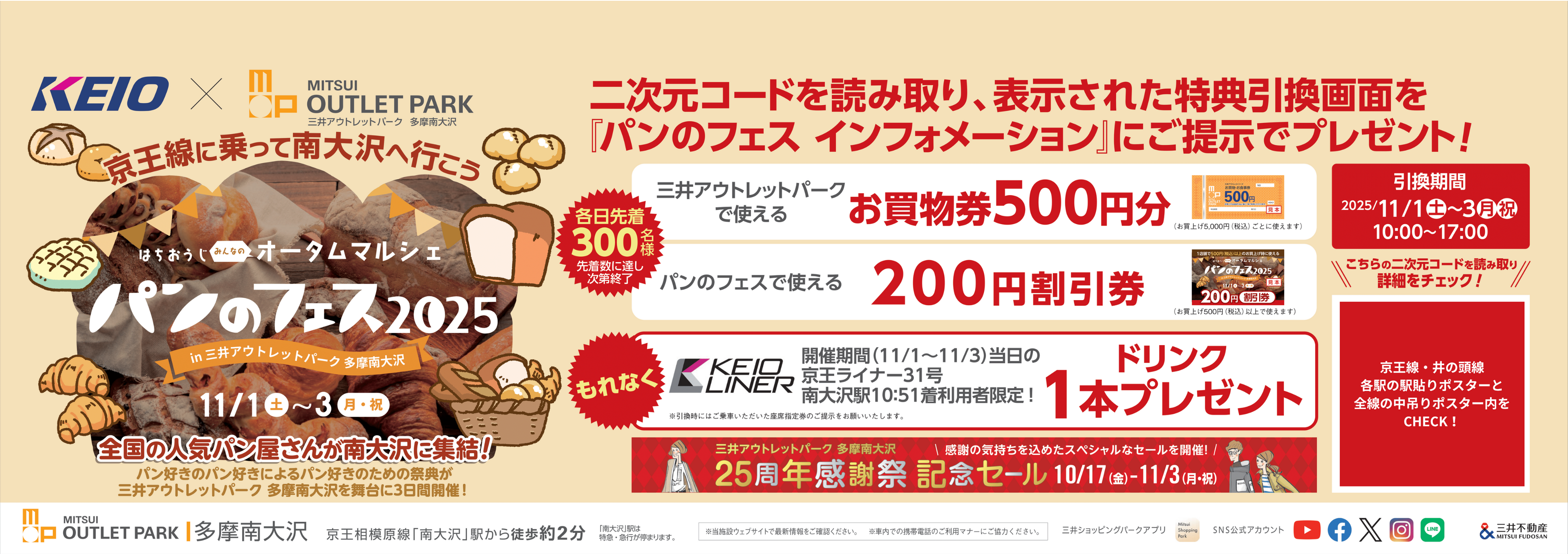 「京王線・井の頭線各駅に掲出する駅ばり、全線の中吊りポスターに記載の二次元コードを読み込んで表示された画面」または「京王アプリ配信投稿に記載のURLからアクセスし表示された画面」(以下、「読み取り画面」)をパンのフェス会場内の「パンのフェスインフォメーション」で提示すると、「パンのフェス」と「三井アウトレットパーク」で利用できる割引券・お買物券を各1枚プレゼントします。