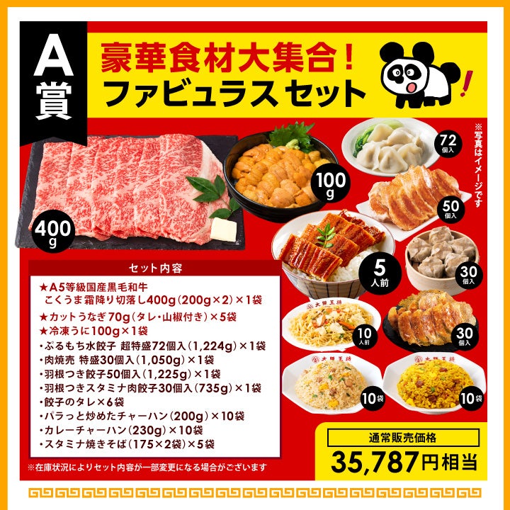 『大阪王将 MEGA中華ガチャSUPER』は大阪王将公式通販サイトにてご購入いただくと、最大35,787円相当の「A5等級国産黒毛和牛・うなぎ・うになどを含む豪華中華惣菜セット(A賞)」など人気中華惣菜がランダムで当たるキャンペーンです。