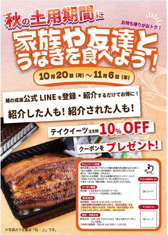 フランチャイズ本部や加盟店への支援を行うフランチャイズビジネスインキュベーション株式会社(本社:滋賀県高島市、代表取締役社長:山本昌弘)がオーナー制に基づき運営する「うまい鰻を腹いっぱい!」をコンセプトにした鰻専門店「鰻の成瀬」は2025年10月20日(月)~11月6日(木)の秋の土用期間にテイクアウト10%値引きキャンペーンを実施します。