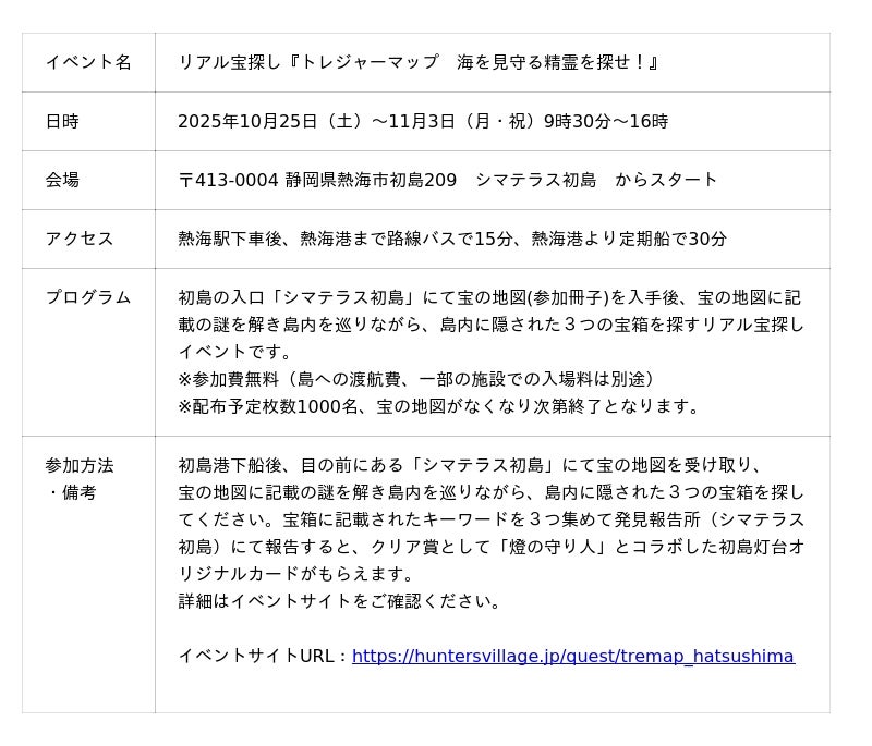 灯台観光ツーリズムコンテンツ化推進コンソーシアムは、2025年10月25日(土)~11月3日(月・祝)に、歴史と文化を学びながら島全体を巡る体験型イベント<リアル宝探し トレジャーマップ~海を見守る精霊を探せ!~>を開催いたします。クリアした方には、クリア賞として「燈の守り人」とコラボした初島灯台オリジナルカードをプレゼント。このイベントは、日本財団「海と日本プロジェクト」の一環として、灯台を中心に地域の海の記憶を掘り起こし、地域と地域、異分野と異業種、日本と世界をつなぎ、新たな海洋体験を創造していく「海と灯台プロジェクト」の助成を受けて実施します。