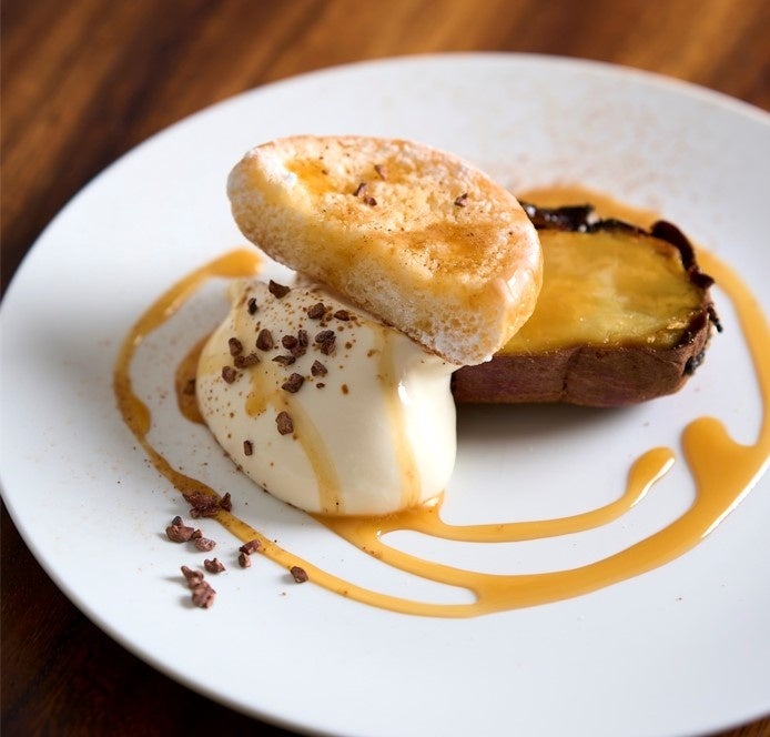 熱で甘みを引き出したお芋に、冷たいマスカルポーネチーズをトッピング!シロップ漬けにして凍らせた、フランスの菓子パン「ブリオッシュ」の食感も楽しい一皿。