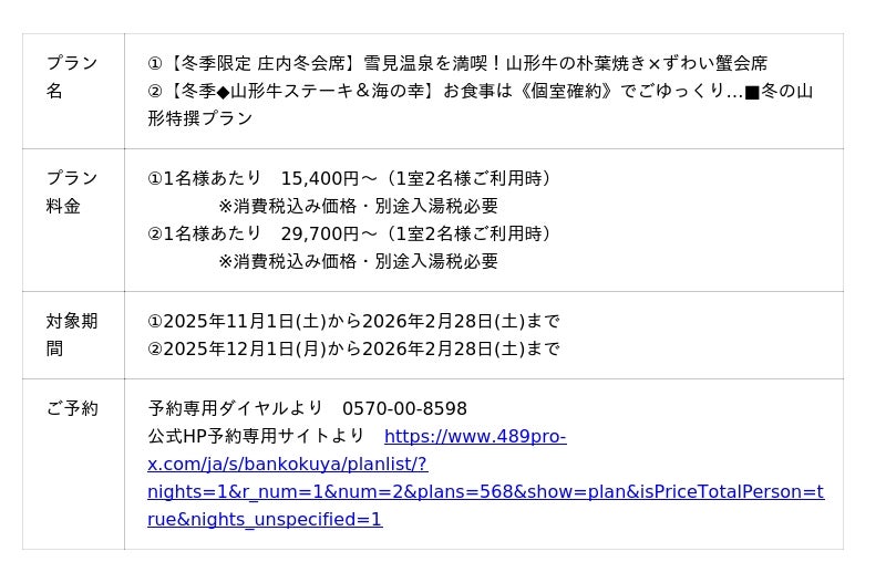 株式会社萬国屋(本社:山形県鶴岡市、代表取締役社長:佐藤 太一)が運営するあつみ温泉 萬国屋(以下「萬国屋」という)は、2025年11月1日(土)から2026年2月28日(土)までの期間限定で、「冬季限定 蟹会席プラン」を提供します。雪景色が広がる静かな温泉地で、旬を迎えるずわい蟹と山形・庄内の冬の恵みを存分にご堪能いただけます。庄内地方は「食の理想郷」とも呼ばれ、四季折々の豊かな食材に恵まれています。今回のプランでは、この地の食文化を、より多くのお客様、特に冬の山形を旅するご家族やカップルの方々にお伝えしたいという思いから、冬の味覚の王様・ずわい蟹をメインにした会席料理をご用意しました。