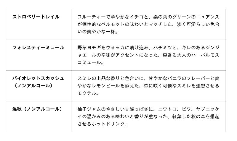 日中のひと時には、柚子ジャムにニワトコ、ヤブニッケイなど温かみのある味わいで秋の森を想起させるノンアルコールの「ホットカクテル(温秋)」。また、仕事終わりの一杯には、野草ヨモギにキレのあるジンジャエールの辛味がアクセントになった大人の「ハーバルモスコミュール(フォレスティーミュール)」。さらに、お酒が苦手な方でも楽しめるスミレシロップとレモンピールを添えた「モクテル(バイオレットスカッシュ)」など、ここでしか味わえない"森を飲む"オリジナルカクテルを堪能いただけます。