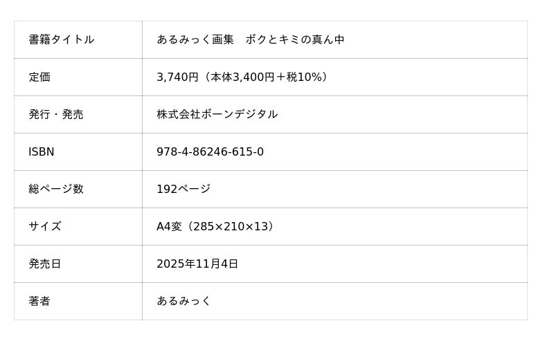 株式会社ボーンデジタル(本社:東京都千代田区、CEO:新 和也、URL:https://www.borndigital.co.jp)は、『あるみっく画集 ボクとキミの真ん中』(著:あるみっく)を2025年11月上旬に発売いたします。