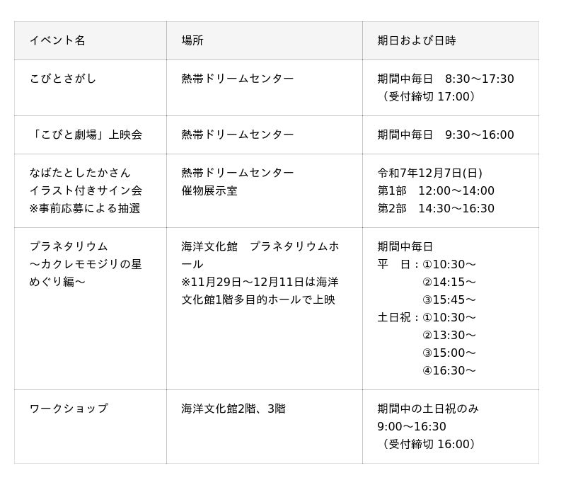 期間中は熱帯ドリームセンターにて子どもから大人まで人気の「こびとさがし」と「こびと劇場上映会」を毎日開催、海洋文化館ではプラネタリウム映像の上映やワークショップと盛りだくさん!12月7日(日)には「こびとづかん」シリーズの作者・こびと研究家のなばたとしたかさんによるイラスト付きサイン会も開催!グッズや書籍を購入できるコーナーもお見逃しなく!