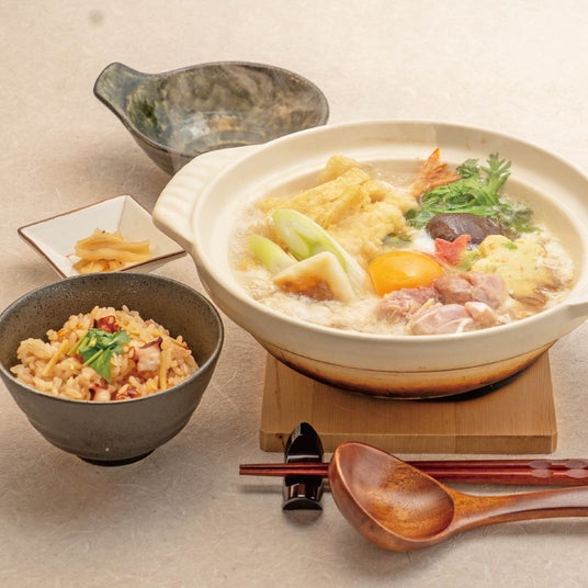 九州産のかつおと北海道産の昆布で丁寧にひいた、当店の"特製お出汁"をたっぷり使用した名物玉子焼と、揚げたての天ぷらがついた天ぷらうどん、季節の炊き込みご飯が付いたひまわりのお出汁を存分に味わっていただけるメニューです。
