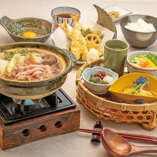 厳選した牛肉とたっぷり野菜を特製の割下でぐつぐつ煮込んだ「牛すき鍋」割下の香りが食欲をそそる!アツアツの牛肉や野菜は、とき卵とからめてご賞味ください。天ぷら盛り合わせは、期間限定でかきフライ2個にも変更できます。