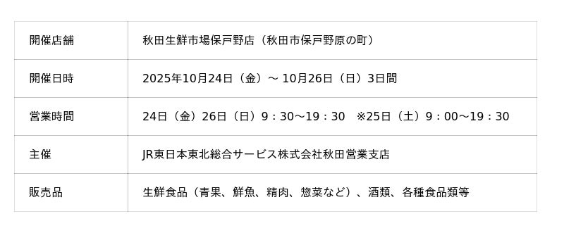 JR東日本東北総合サービス株式会社(本社:宮城県仙台市、代表取締役社長:弭間 俊則 )は秋田生鮮市場保戸野店(秋田県秋田市)において、10月24日(金)~26日(日)の期間「2025年秋田生鮮市場保戸野店大創業祭」を開催します。お得な商品の販売や毎年恒例のガラポン抽選会、秋田・東北で人気のご当地品の限定販売など、楽しいイベントが盛りだくさんです!開店以来25年の感謝を込めて大奉仕!皆さまのご来店を心よりお待ちしております。