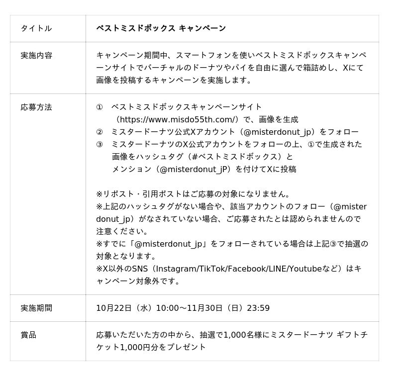 本キャンペーンは、スマートフォンを使いバーチャル上であなたの推しドを楽しく箱詰めした画像を投稿するキャンペーンです。ベストミスドボックスキャンペーンサイトにアクセスし、あなただけのベストミスドボックスを作成。ミスタードーナツ公式Xアカウント(@misterdonut_jp)をフォローのうえ、ハッシュダグ(#ベストミスドボックス)とメンション(@misterdonut_jp)を付けてXに画像を投稿いただくと、ミスタードーナツ公式ホームページにて投稿いただいた作品をご覧いただけるほか、抽選で1,000名様にミスタードーナツギフトチケット1,000円分をプレゼントします。