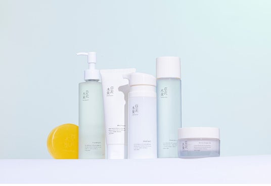 写真左から:草花木果 洗顔石けん、草花木果 メイク落としオイル N、草花木果 ホイップフォーム、草花木果 マスクジェル C、草花木果 エッセンスローション、草花木果 エンリッチクリーム EX の6品目(エッセンスローションはつめかえ用もあり)