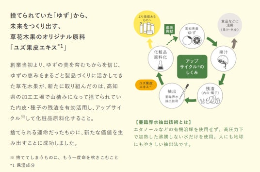 草花木果は、古くから日本で美容や健康のために取り入れられてきた自然の力として、"ゆず"を大切にしてきました。高知県の加工工場を訪れた2021年秋、そのゆずの加工過程で搾汁される量の半分を占める内皮・種子が未使用のまま大量に廃棄されていることを知り、「何とか活用することができないか?」という想いから、ゆずの残渣(ざんさ)を化粧品原料に変える取り組みに挑戦。「草」「花」「木」「果」の植物とともに、豊かな大地の恵みを無駄にすることなく、新しい価値と可能性を見出すという素材・原料へのこだわりを徹底し、化粧品原料化に成功いたしました。2025年2月に発売した草花木果<毛穴・ハリケア>より、ゆずの残渣を有効活用した「ユズ果皮エキス*¹」を商品に配合しています*²。