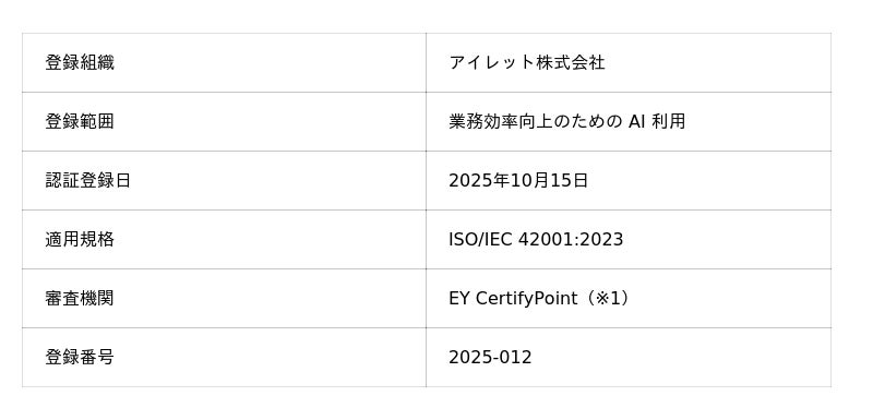 システム・アプリケーションの開発、グラフィック・UI/UX デザイン制作からインフラの構築・運用までをワンストップで提供するアイレット株式会社(本社:東京都港区、代表取締役社長:岩永充正、以下 アイレット)は、国際標準化機構(ISO)並びに国際電気標準会議(IEC)が発行する国際規格である「ISO/IEC 42001(AI マネジメントシステム)」の認証を2025年10月15日付で取得したことを発表します。これにより、当社は AI 技術の責任ある利用とガバナンス体制を国際基準に則り確立したことが認証されました。