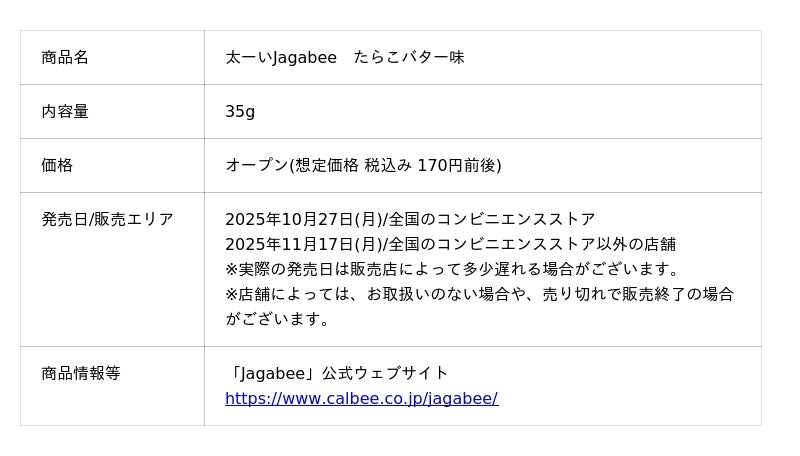 カルビー株式会社(本社:東京都千代田区、代表取締役社長兼CEO:江原 信)は、じゃがいもの味わいと独自の食感が楽しめる「Jagabee(じゃがビー)」より、太めのウェーブカットが特長の『太~いJagabee たらこバター味』を、2025年10月27日(月)から全国のコンビニエンスストア先行で期間限定発売します。コンビニエンスストア以外の店舗は2025年11月17日(月)から期間限定発売します(2026年4月終売予定)。