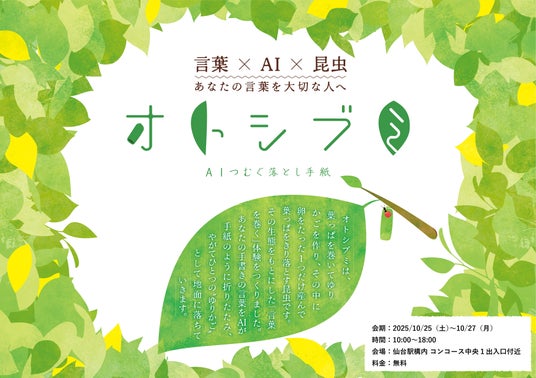 研究とポップカルチャーの融合を掲げるクリエイティブレーベルAcademimic(東京都渋谷区)は、日建設計総合研究所(東京都千代田区)とともに展開する「Ki Sci Iki(キサイイキ)」プロジェクトの第一弾として、言葉と昆虫、そしてAIの体験型インスタレーション『オトシブミ - AIつむぐ落とし手紙 -』を2025年10月25日(土)~27日(月)の10:00~18:00、仙台駅構内にて開催します。本プロジェクトは、都市の中で活用されていない空間を発掘し、アートや研究の発信の場として生かす社会実験的な試みです。公共空間を活用したい施設管理者や自治体と、研究や表現を通じて社会と関わりたい研究者・クリエイターをつなぐ場づくりを目指し、都市の余白を新しい価値へと変換していきます。