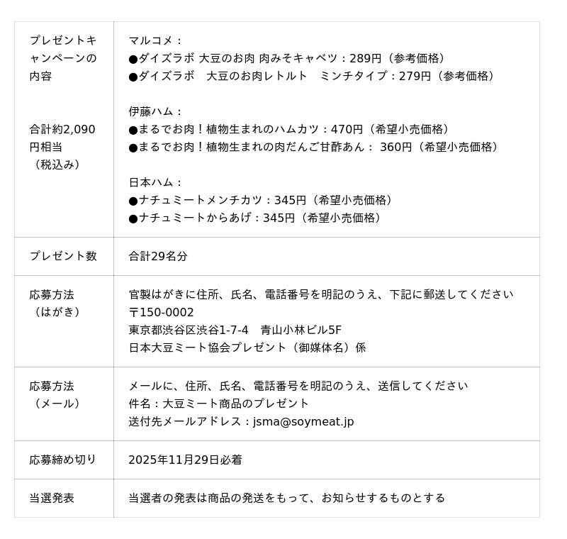 目的に設定しました。本プレゼントキャンペーンでは、大豆ミート協会加盟企業5社による選りすぐ