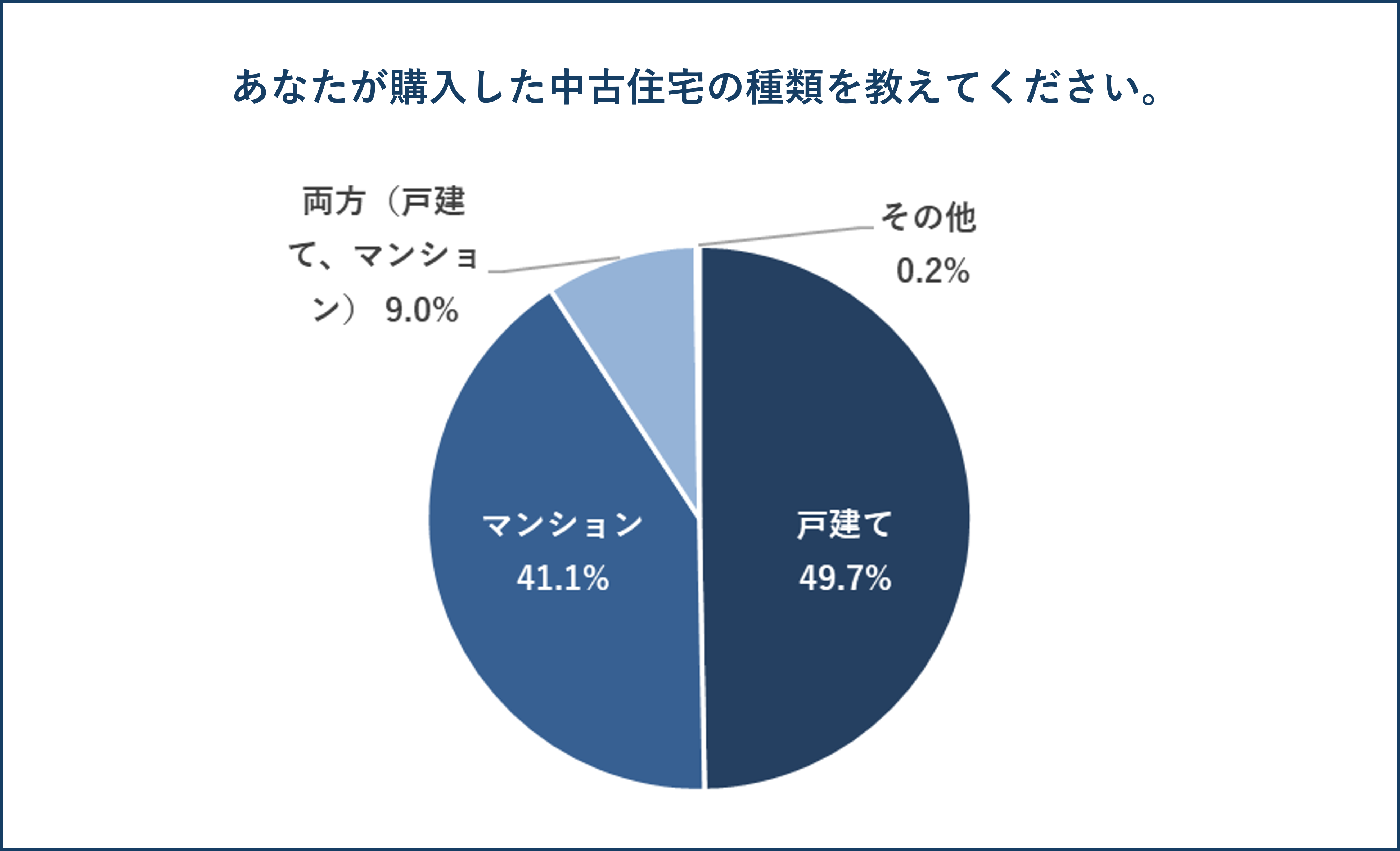 購入した中古住宅の種類を聞いたところ、「戸建て」が49.7%、「マンション」が41.1%という回答で、やや「戸建て」が多い結果になっています。また、「両方(戸建て、マンション)」を購入したという回答が9.0%ありました。