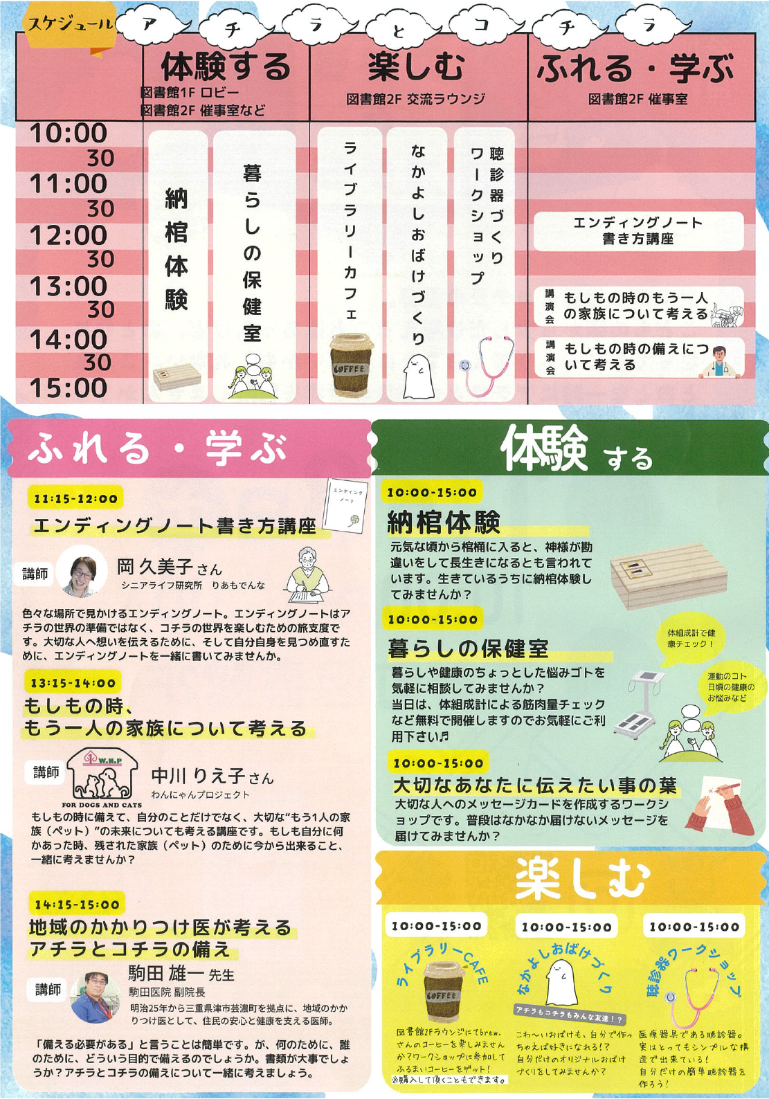 講演会では、「エンディングノートの書き方講座」、「もしもの時、もう一人の家族について考える」、「地域のかかりつけ医が考えるアチラとコチラの備え」といったテーマで、将来の備えや家族のことなどを学ぶことができます。