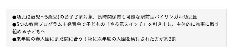 - 英会話、知能、運動、ライフスキル、プログラミングの5つのスキル教育と月に1回の発表会を実施することによって、インプットとアウトプットを循環させ「考える力」「表現する力」をバランスよく伸ばす