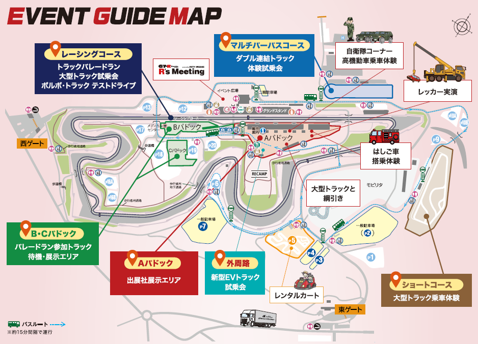 富士スピードウェイを全面貸切して開催いたします。 各コンテンツの実施個所は以下のマップをご参照ください。場内はシャトルバスが約15分間隔で運行し、各コンテンツエリアへとご案内いたします。