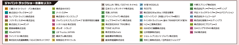 最新のトラック車両、トラック用アクセサリ、タイヤ、ホイール、カスタムパーツなど約50社のトラック関連メーカー、ディーラーがブーステントを構え、車両や新製品など展示するほか即売会も行います。また運送会社によるブース展示で企業PRやリクルーティング活動なども実施。トラック・輸送業界関係者をはじめ一般の方など多くの来場者で賑わいます。