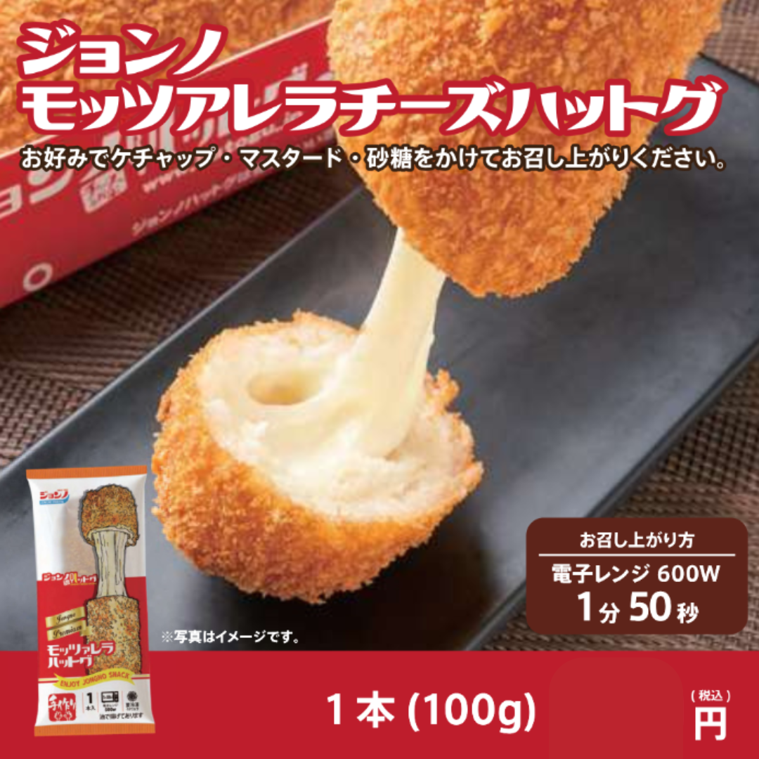冷凍モッツァレラチーズ ハットグ外はサクッと、中はとろ~りチーズが楽しめるモッツァレラチーズハットグです。