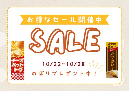 のぼりプレゼント!冷凍モッツァレラチーズ ハットグ・大盛りカツカレーをご購入いただいたお客様にのぼりをプレゼント!