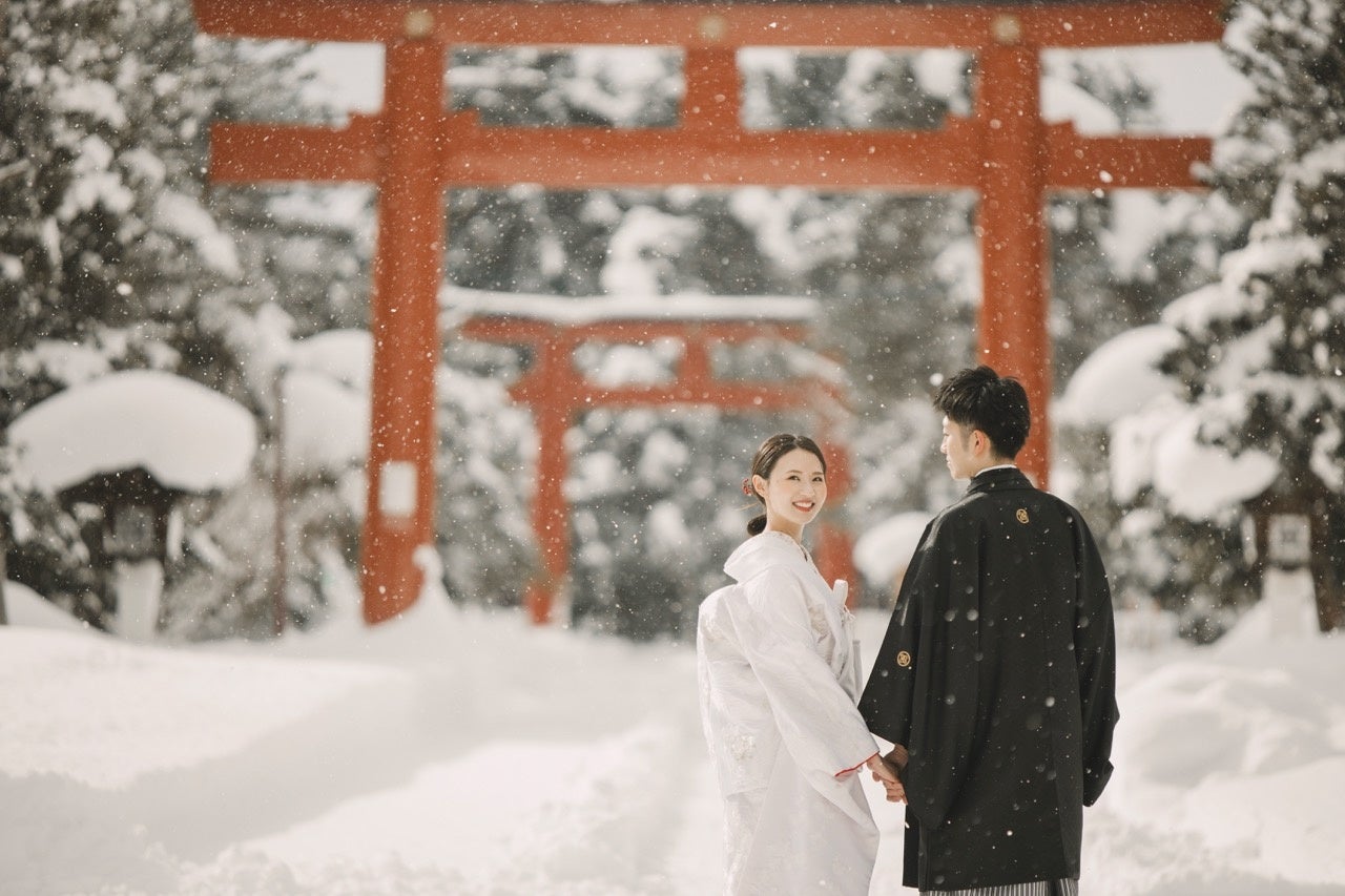 降り注ぐ雪や澄みきった空気- 冬の季節は、他の時期には出会えない幻想的で美しいウェディングフォトを叶えます。ロマンチックな雪景色を背景にした撮影は、まるで映画のようで、特別な瞬間を写真に残したいと考える20代カップルに大人気です。