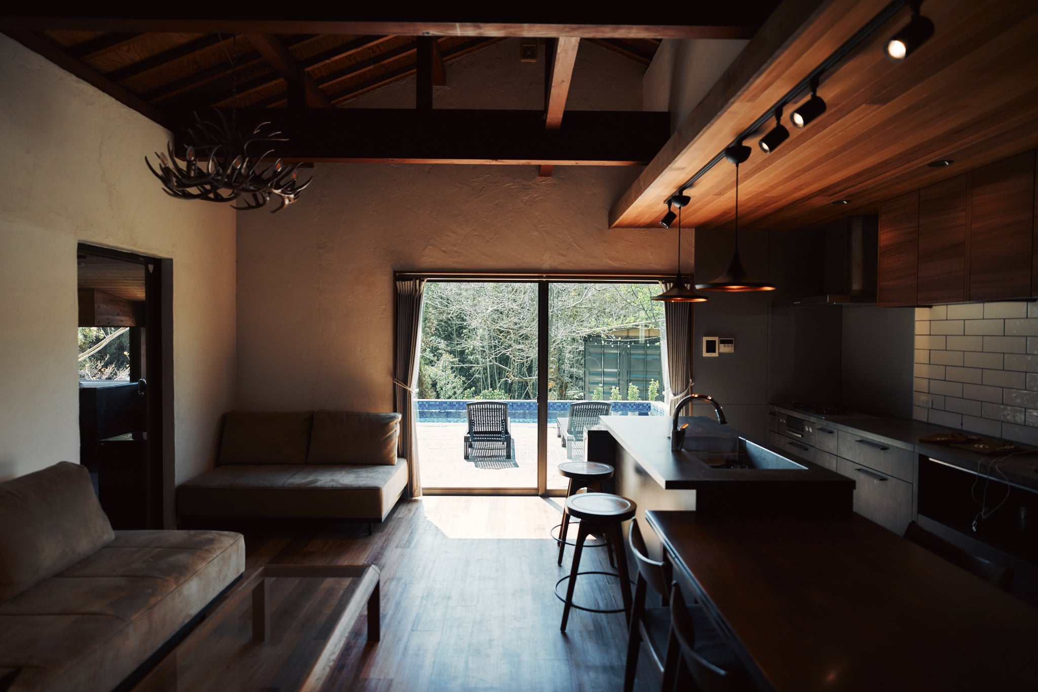 森の中に備えたプールは長さ8 m・幅3.5 m・深さ1.3 mの完全プライベート仕様で、朝の目覚めのひと泳ぎから夜のライトアップまで優雅なひとときを味わえます。