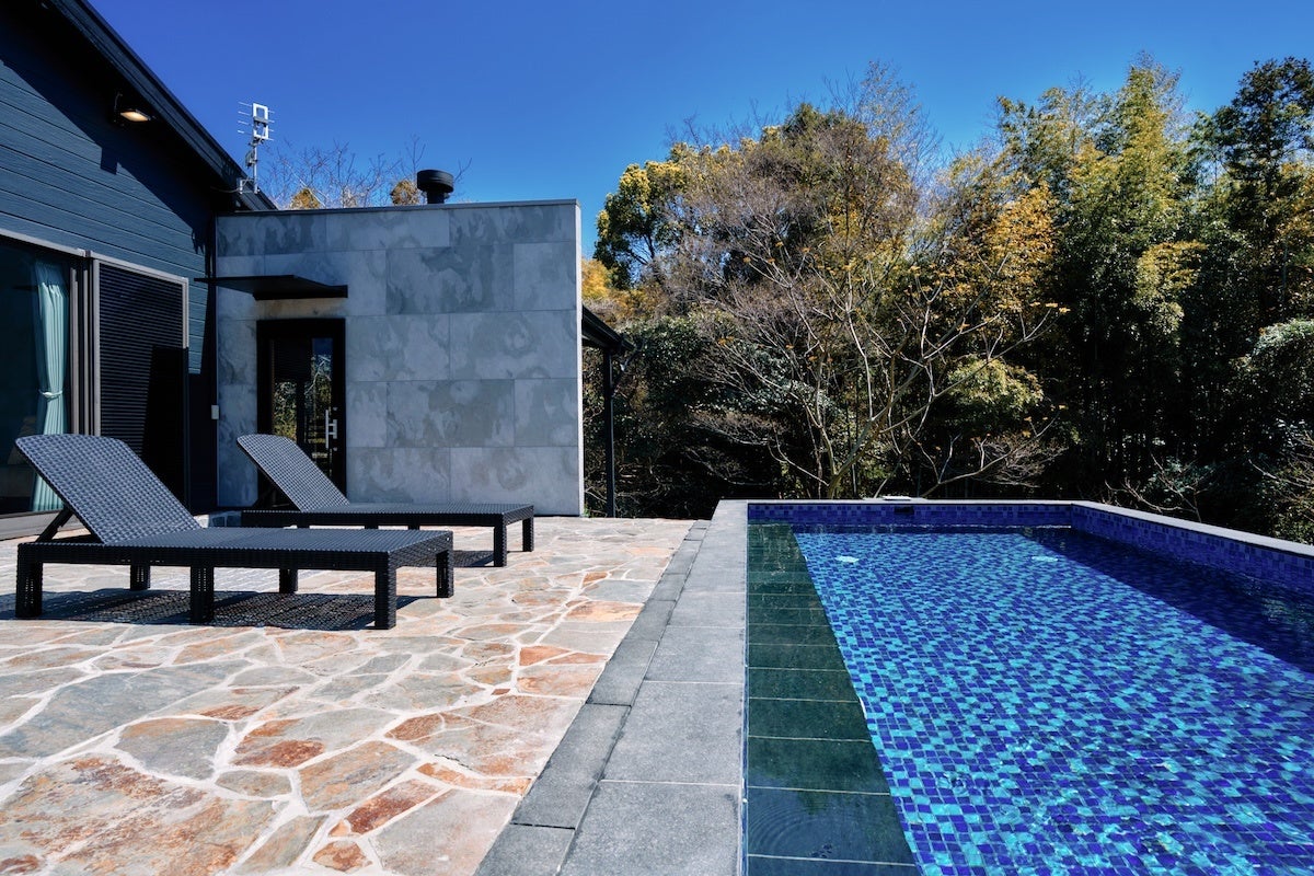 現地は玄界灘の美しい海岸線と豊かな森に囲まれ、車でビーチまで約5分、世界遺産の宗像大社まで約10分という好立地。プール・サウナ・水風呂・BBQテラスを備え、全てのペットと宿泊できる宗像市初の隠れ家宿※として今年5月に開業し、皆さまからご好評をいただいております。