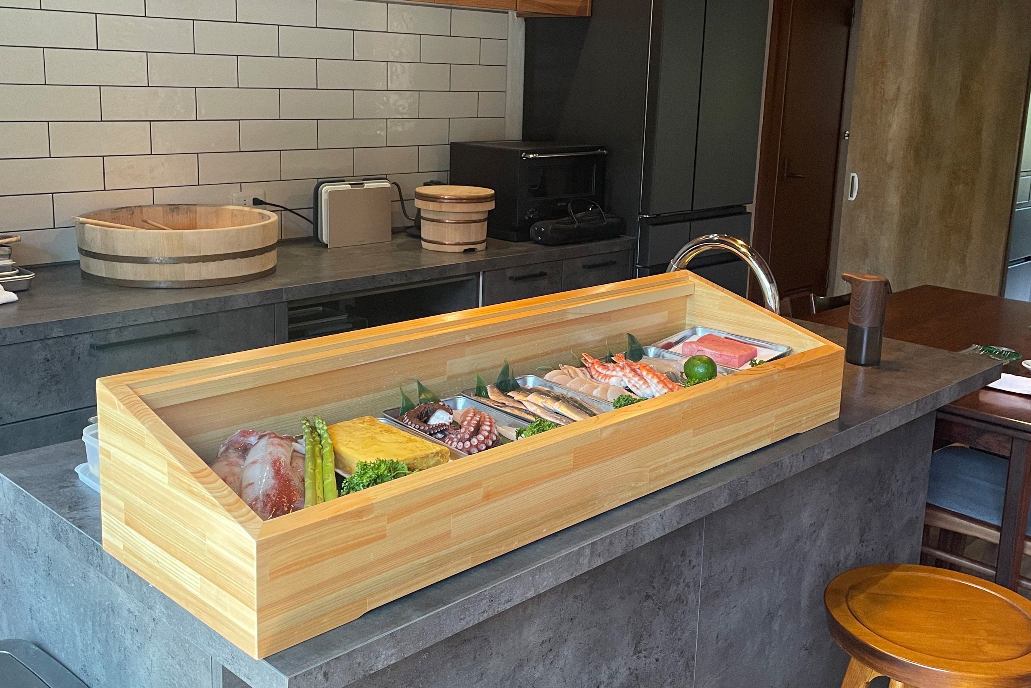 ダイニングにはカウンターキッチン、暖炉、囲炉裏、薪かまどが揃っており、お料理好きな方には最適な環境です。地元シェフによる出張ケータリングでは、玄界灘の魚介や宗像牛を使った囲炉裏料理のほか、新鮮なネタを薪かまどで炊いた銀シャリと共に味わうおまかせ寿司、季節の食材を活かした繊細なフレンチ、素材を活かした多国籍料理など、多彩な料理を楽しめます。※ケータリングは事前予約が必要です。