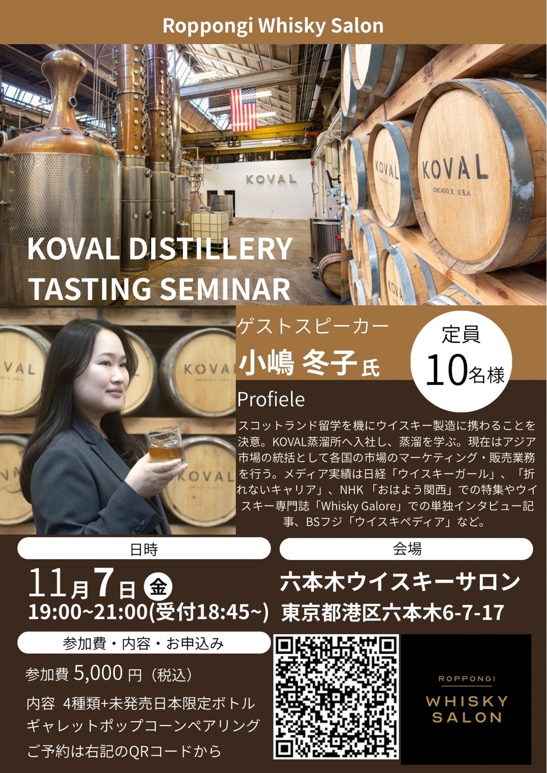 BAR六本木ウイスキーサロンは、KOVALアジアブランドマネージャーの小嶋冬子氏をゲストに迎え、スコットランド留学からKOVAL蒸留所での経験、そしてアジア市場を統括する現在に至るまでのキャリアと、KOVALの魅力に迫るセミナーを実施。当日は、KOVALの定番ウイスキー4種に加え、未発売の日本限定ボトルを含む貴重なテイスティングが楽しめます。さらに、シカゴ名物の「ギャレットポップコーン」とのユニークなペアリングもご提供。メディアでも活躍する小嶋氏の講演と特別なテイスティングを通じて、KOVALの革新的なスピリッツの世界をご体験ください。