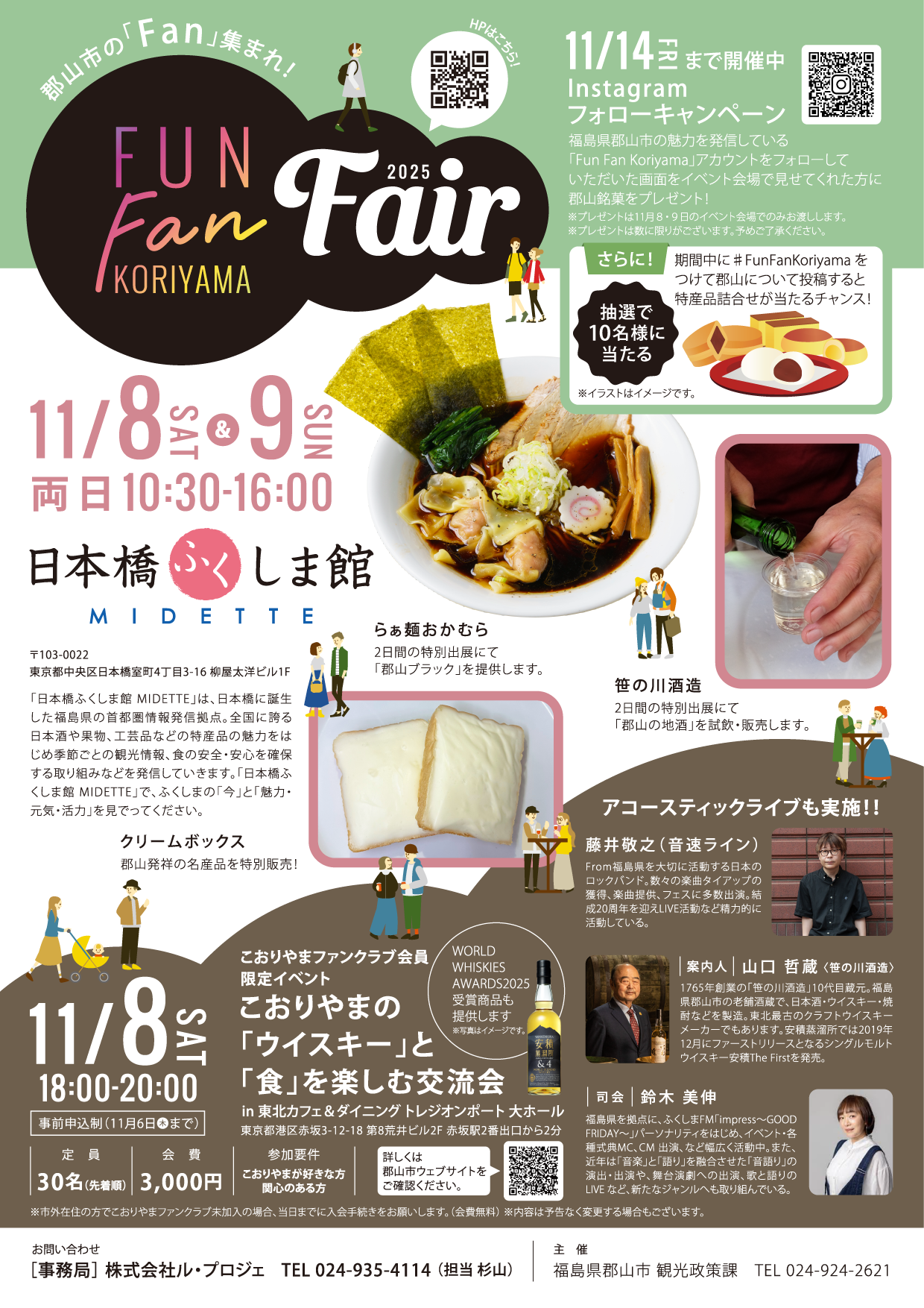 当日は、福島県を拠点にイベントMC、CM出演等幅広く活動されている「鈴木美伸さん」が司会を務め、ゲストには「郡山市在住のアーティスト『藤井敬之さん(音速ライン)』」、案内人として「笹の川酒造10代目蔵元 『山口哲蔵さん』」を招き、トークセッションやアコースティックライブを通じて郡山市の魅力を深掘りしていきます。