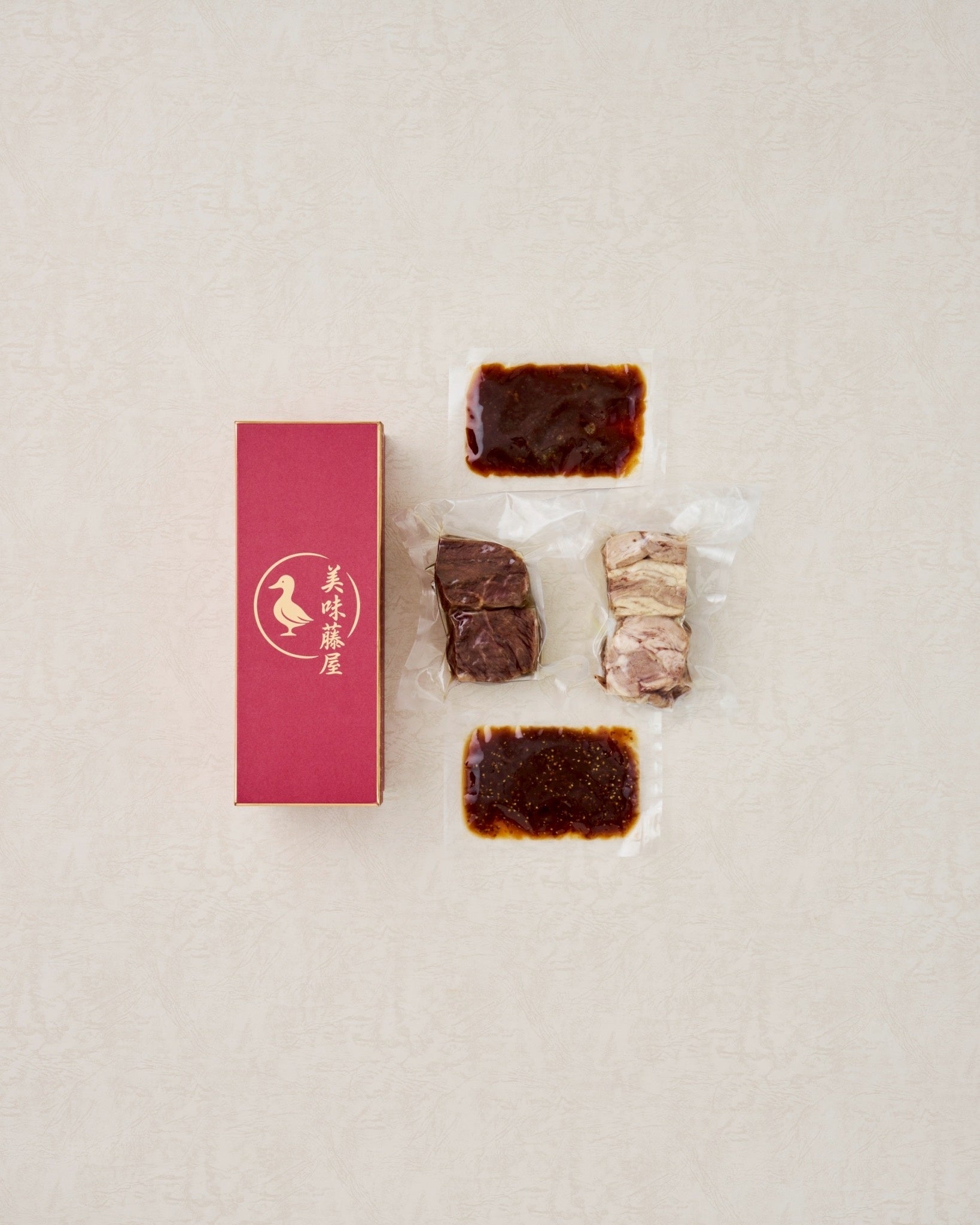美味藤屋ビーフ赤ワイン煮厳選した国産牛ホホと牛バラをお箸でほぐれる柔らかさになるまで赤ワインでじっくり煮込みました。付属の特製ソースとあわせれば、食卓のメインディッシュに。