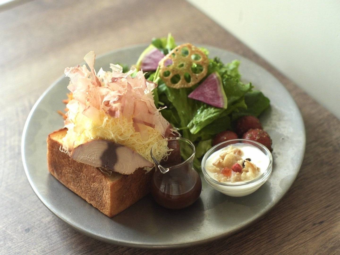香り豊かなかつお節と"生節(なまぶし)"、チーズを、パンとエスプレッソとの看板商品の食パン「ムー」に練り込み、香ばしく炙って、仕上げに醤油マヨと"踊るかつお節"をたっぷりトッピング。