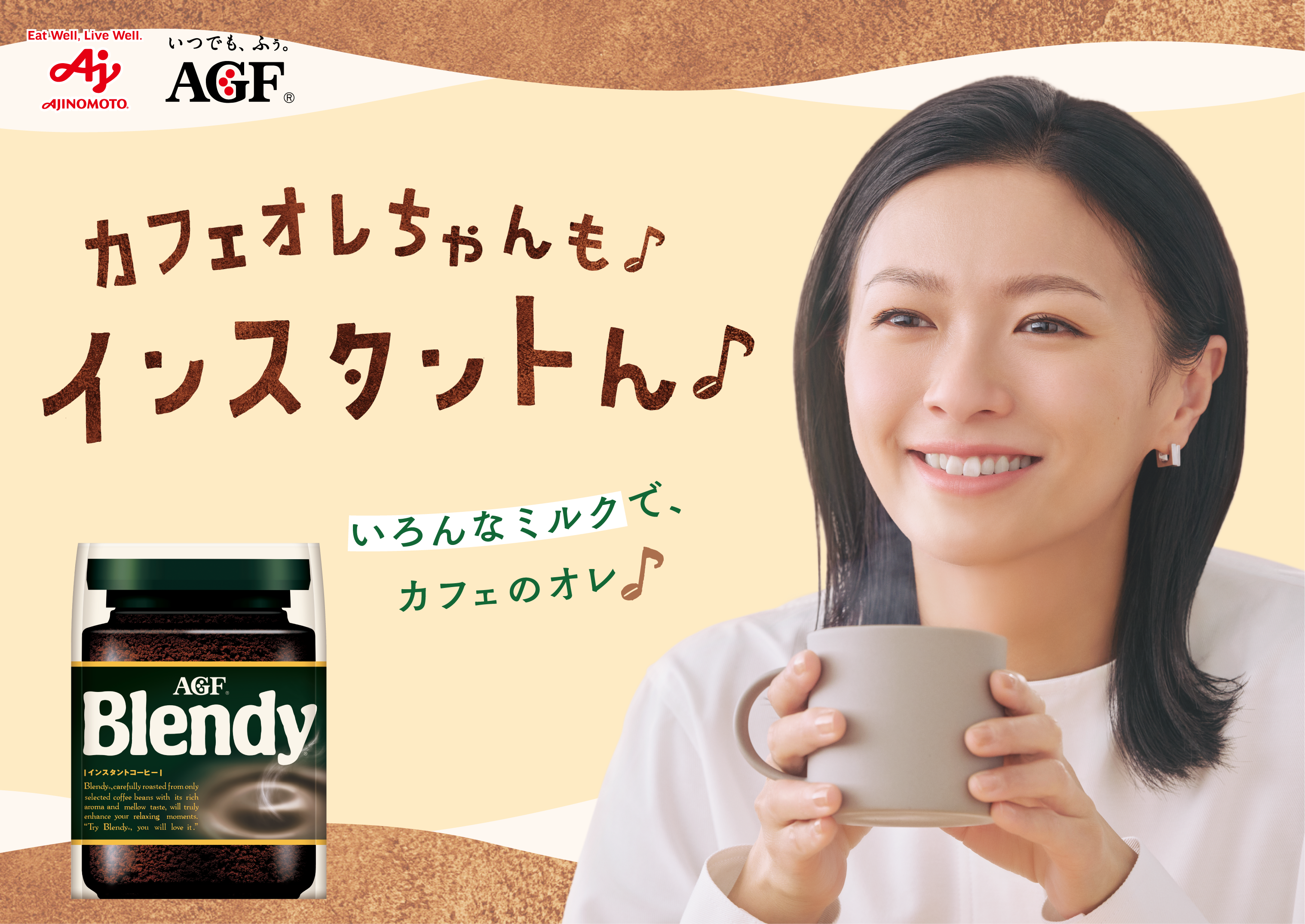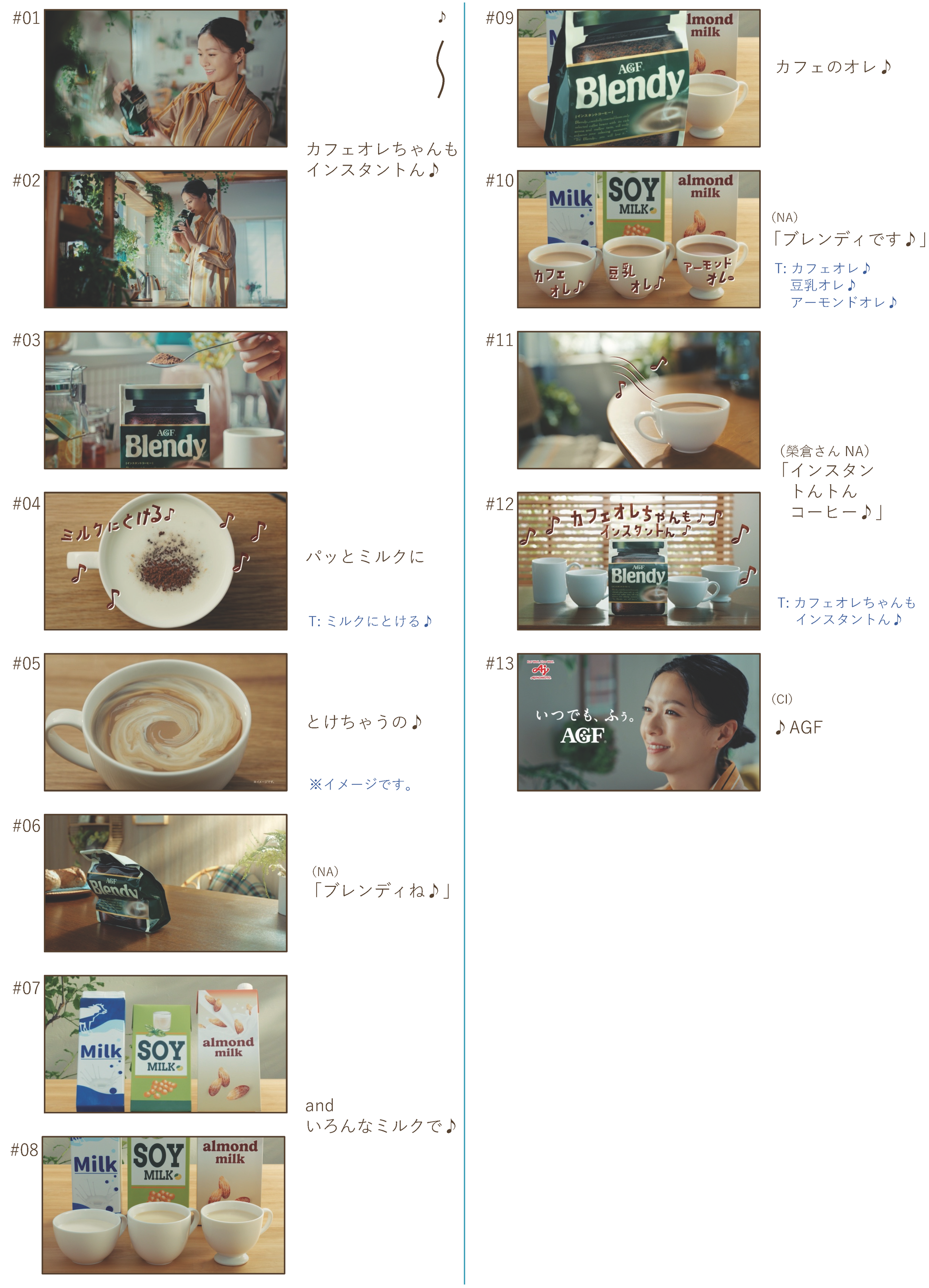 豊かなコクと香りが特長で、牛乳はもちろん、豆乳やオーツミルク、アーモンドミルクなどの植物性ミルクとも相性が良く、カフェで飲むようなオレが手軽に楽しめる「ブレンディ(R)」インスタントコーヒーより、新TVCMを公開します。本TVCMでは"カフェオレちゃんも、インスタントん"という新たなキーコピーを中心に、様々なミルクに「ブレンディ(R)」インスタントコーヒーを加えるだけでカフェで飲むようなオレが手軽にご自宅に楽しめる点を伝達しています。