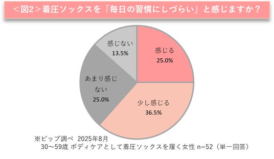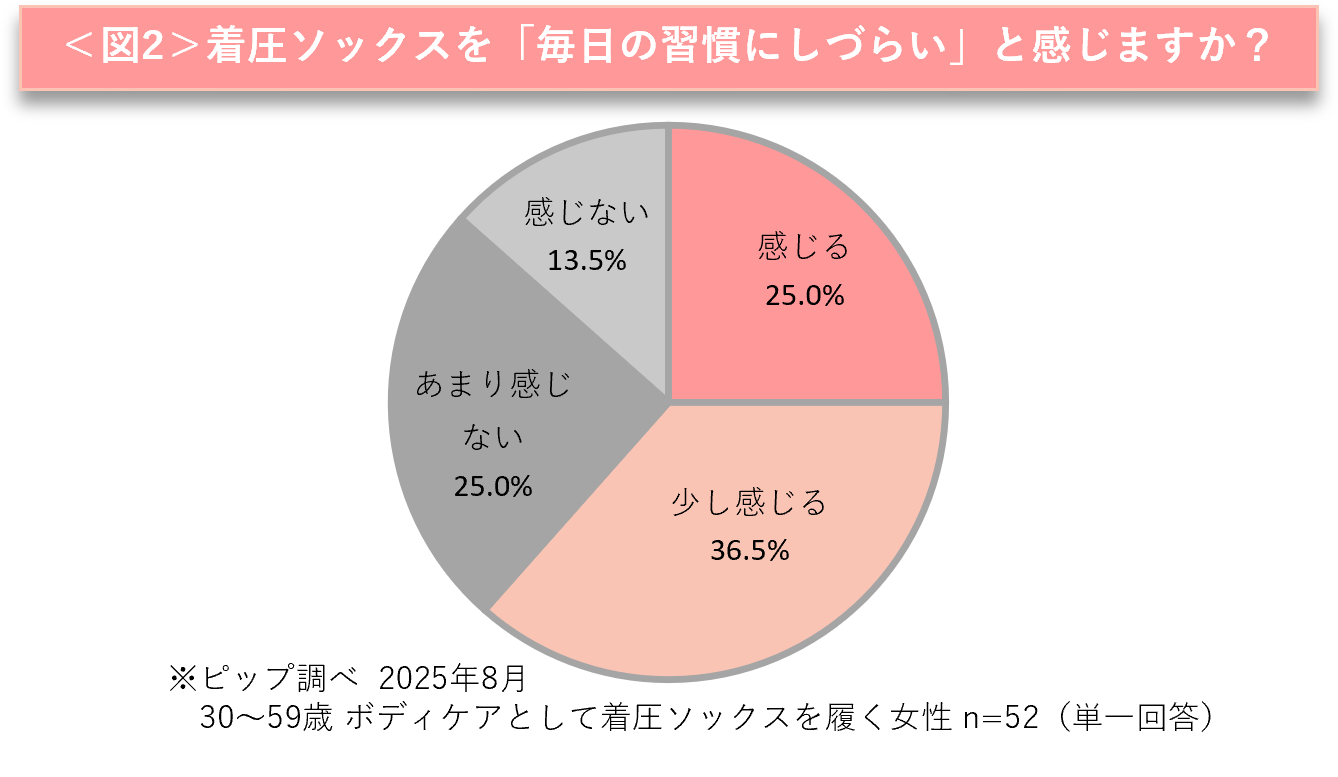 ボディケアアイテムのひとつである、着圧ソックスにおいても「外見のケア」だけではなく、「内側を意識したケア」が期待されています。しかしその一方で、着圧ソックスの使用頻度に関する実態を調査したところ、61.5%の人が毎日の習慣化に難しさを感じていることが判明しました<図2>。