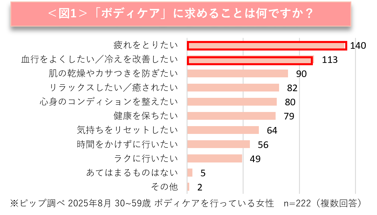 ボディケアにおいて、疲労や血行改善といった内側のケアを重視していることが判明した。