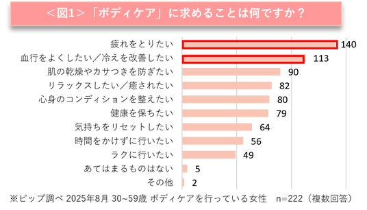ピップの調査によると、ボディケアを行っている30~50代女性 222名のうち、63.1% がボディケアで「疲れを取りたい」と回答、さらに50.9%の人がボディケアで「血行や冷えを改善したい」と考えていることが分かりました<図1>。ボディケアは「綺麗に見せるため」に行うものという印象もありますが、半数以上の女性が外見だけでなく、身体の内側のケアを重視していることが判明しました。