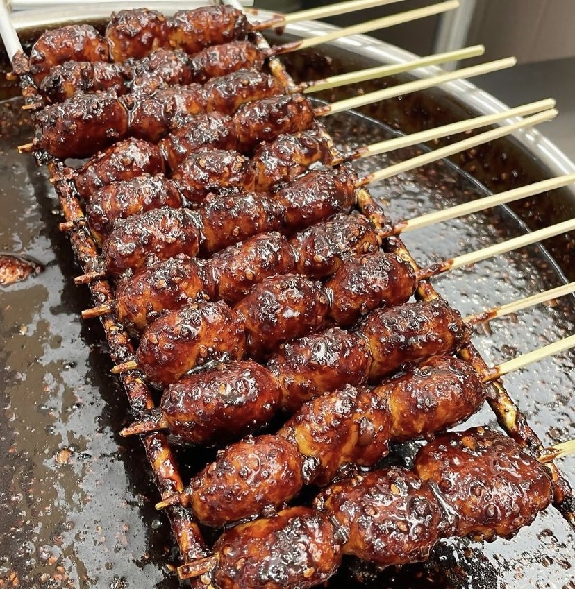 醤油ベースの秘伝のたれには、砂糖・胡麻・落花生・クルミが入っています。くせになる美味しいたれがモチモチした食感の団子型の餅に絡まります。