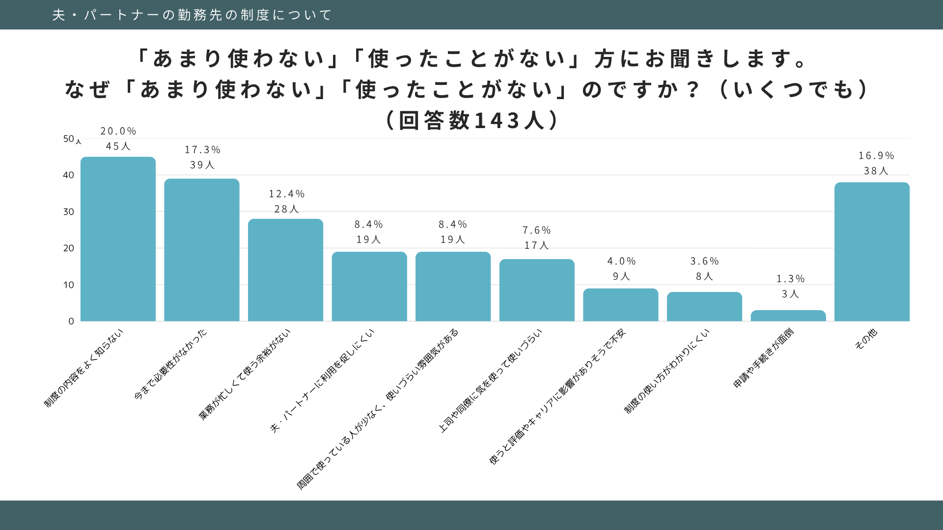 「実際に利用したことがある」と答えた人は3割以下となっています。 また、「制度の内容をよく知らない」「今まで必要性がなかった」と回答した人がそれぞれ約2割に達し、 「上司や同僚に気を使って利用しづらい」「使うと評価やキャリアに影響がありそうで不安」といった声も少なくありませんでした。