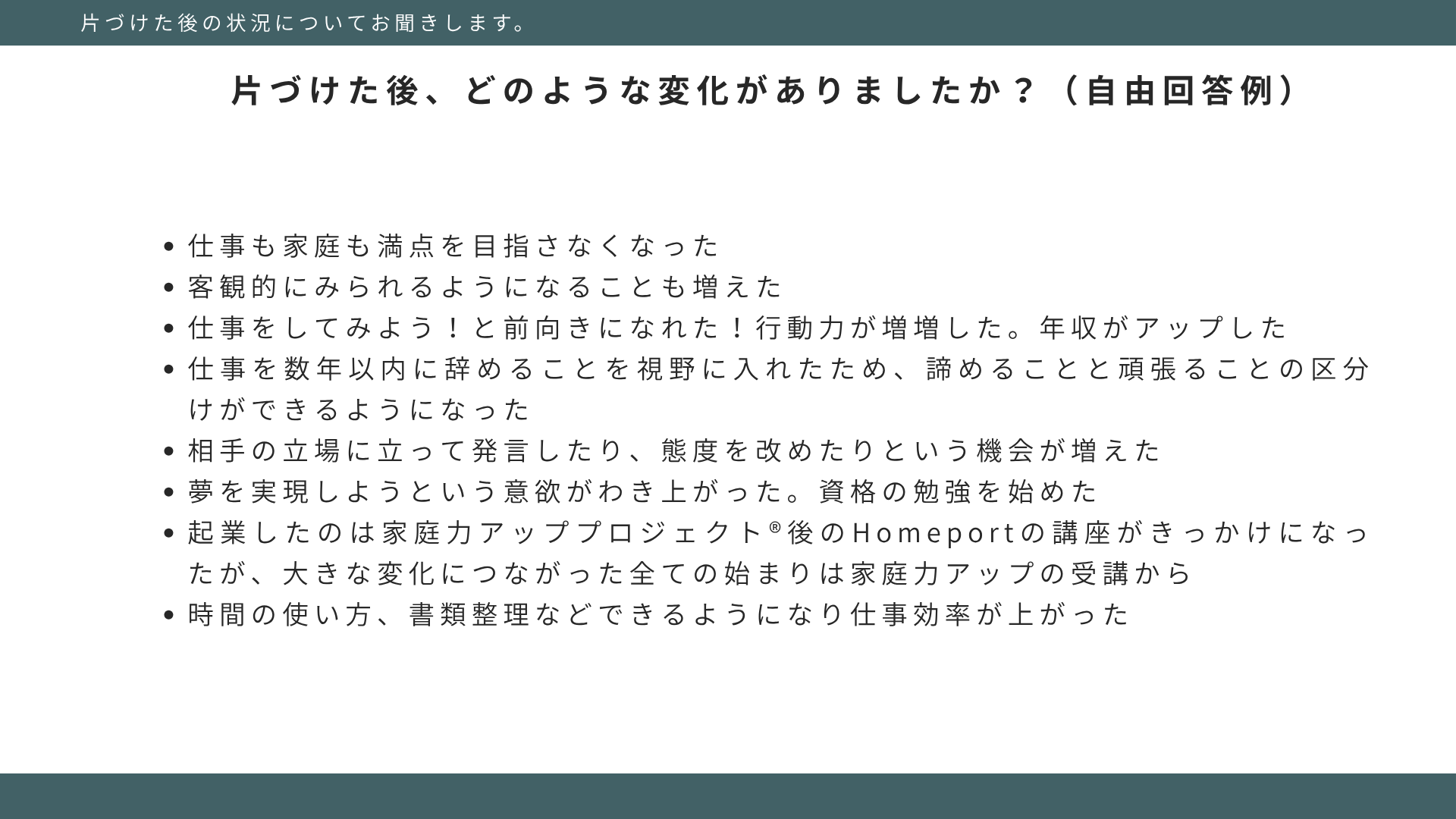 一方で、「家庭力アッププロジェクト(R)」を受講した人の中には、「仕事に前向きになれた」「新しい挑戦に踏み出した」「資格の勉強を始めた」「起業のきっかけになった」など、家庭を整える過程で自己効力感が高まり、キャリアの再スタートを切ったという声が多く寄せられています。